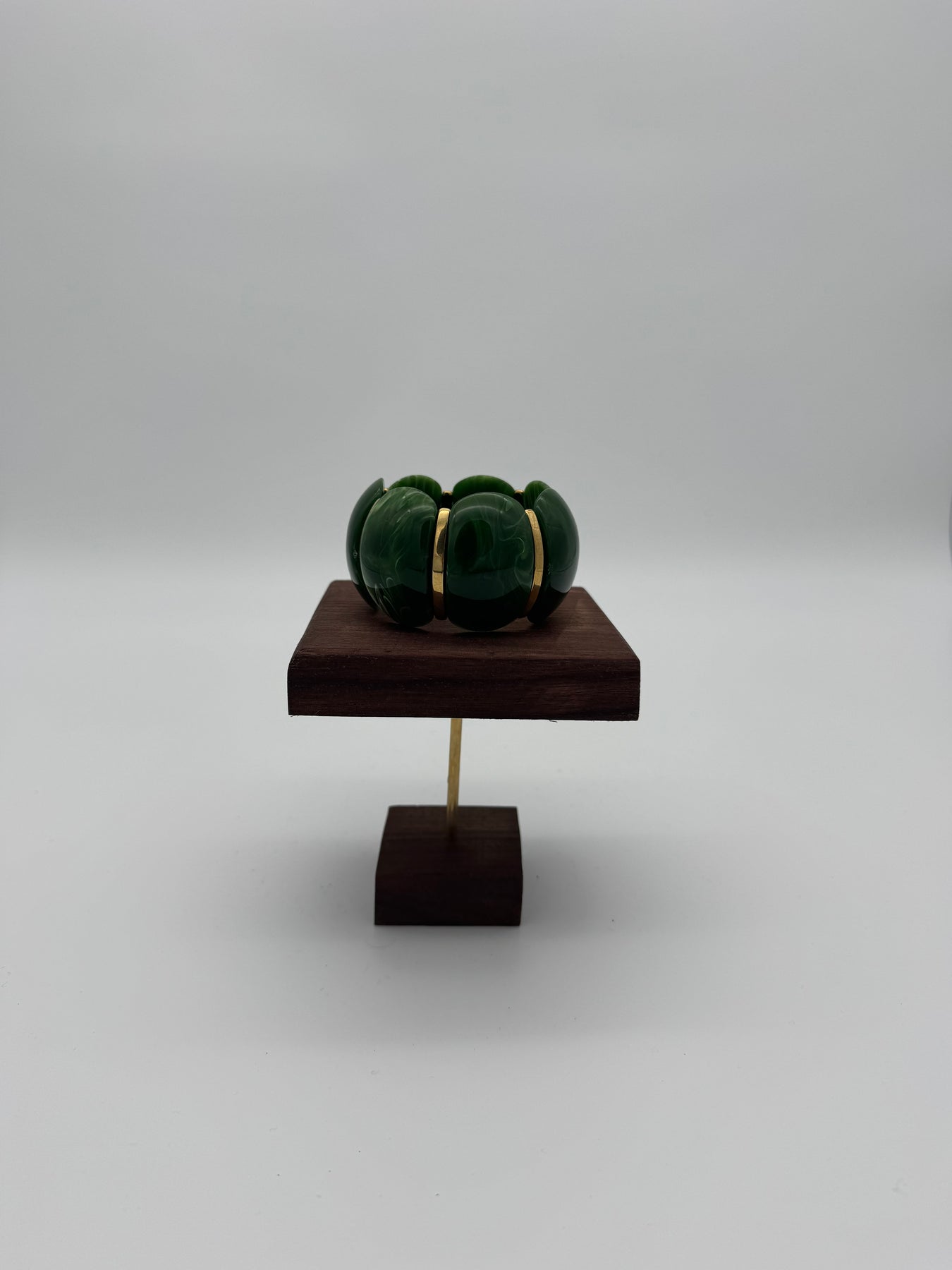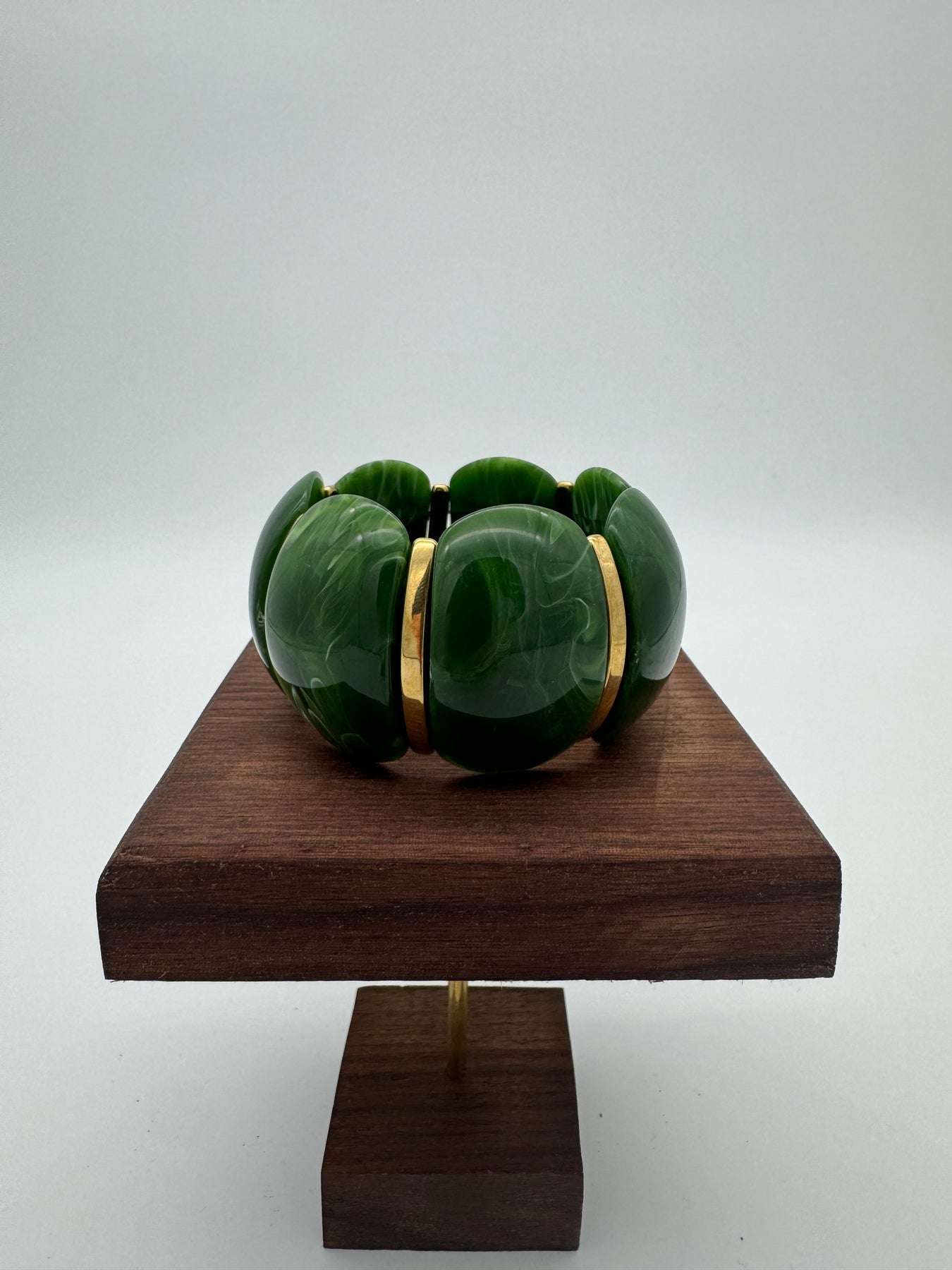 Le bracelet vert apporte une touche élégante et lumineuse à votre poignet. Ses larges maillons en résine effet marbré vert profond sont sublimés par des séparations dorées pour un rendu chic et moderne. Un bijou fort, idéal pour rehausser une tenue sobre comme une tenue plus habillée.
