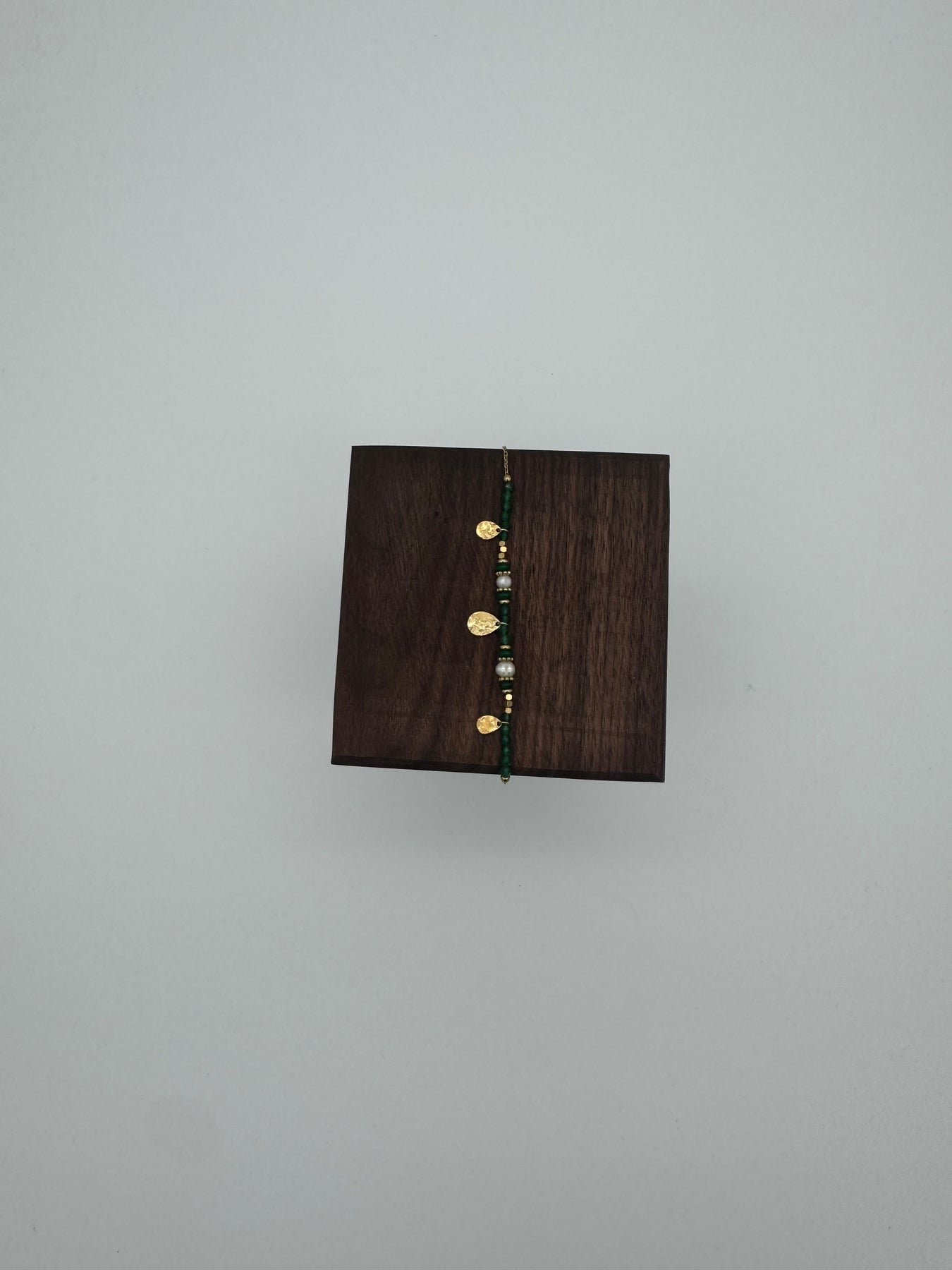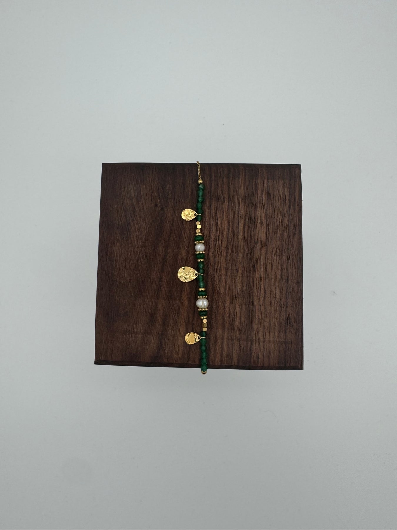 Le bracelet vert et or à perles et pampilles séduit par son esprit bohème chic et sa touche lumineuse. L’association du vert profond, des perles blanches et des pampilles dorées crée un bijou délicat, plein de caractère, qui sublime le poignet avec élégance et originalité.