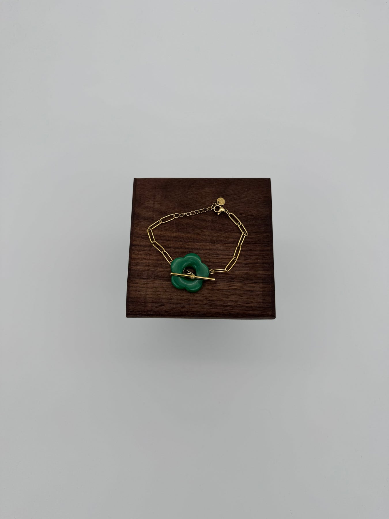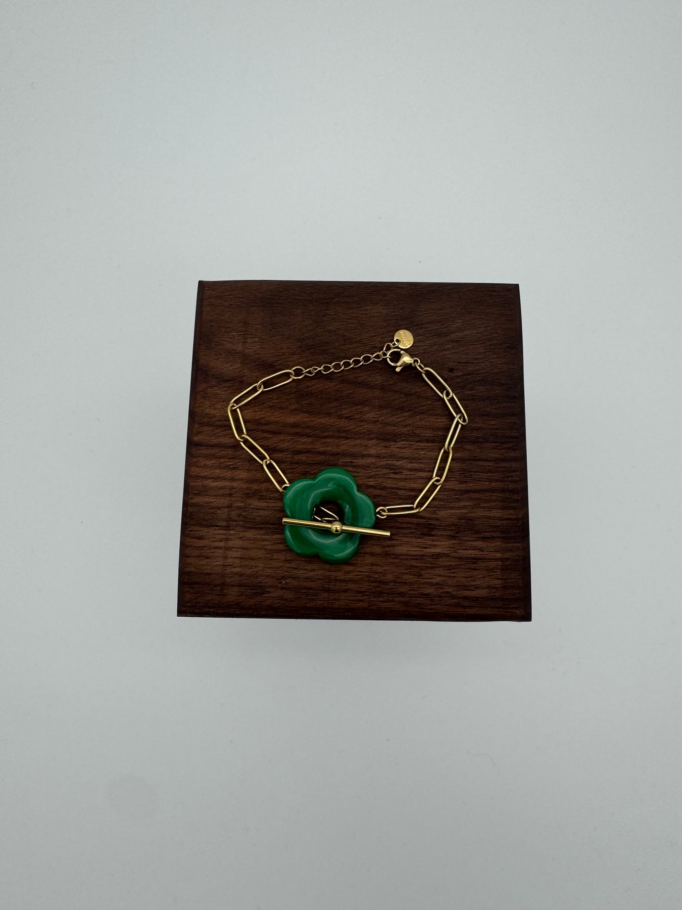 Le bracelet doré à chaîne fine sublimé par sa fleur verte apporte une touche de fraîcheur, de féminité et d’élégance à votre poignet. Son design délicat, associé à la douceur de la pierre verte, en fait un bijou raffiné qui se porte aussi bien au quotidien que pour les occasions spéciales.