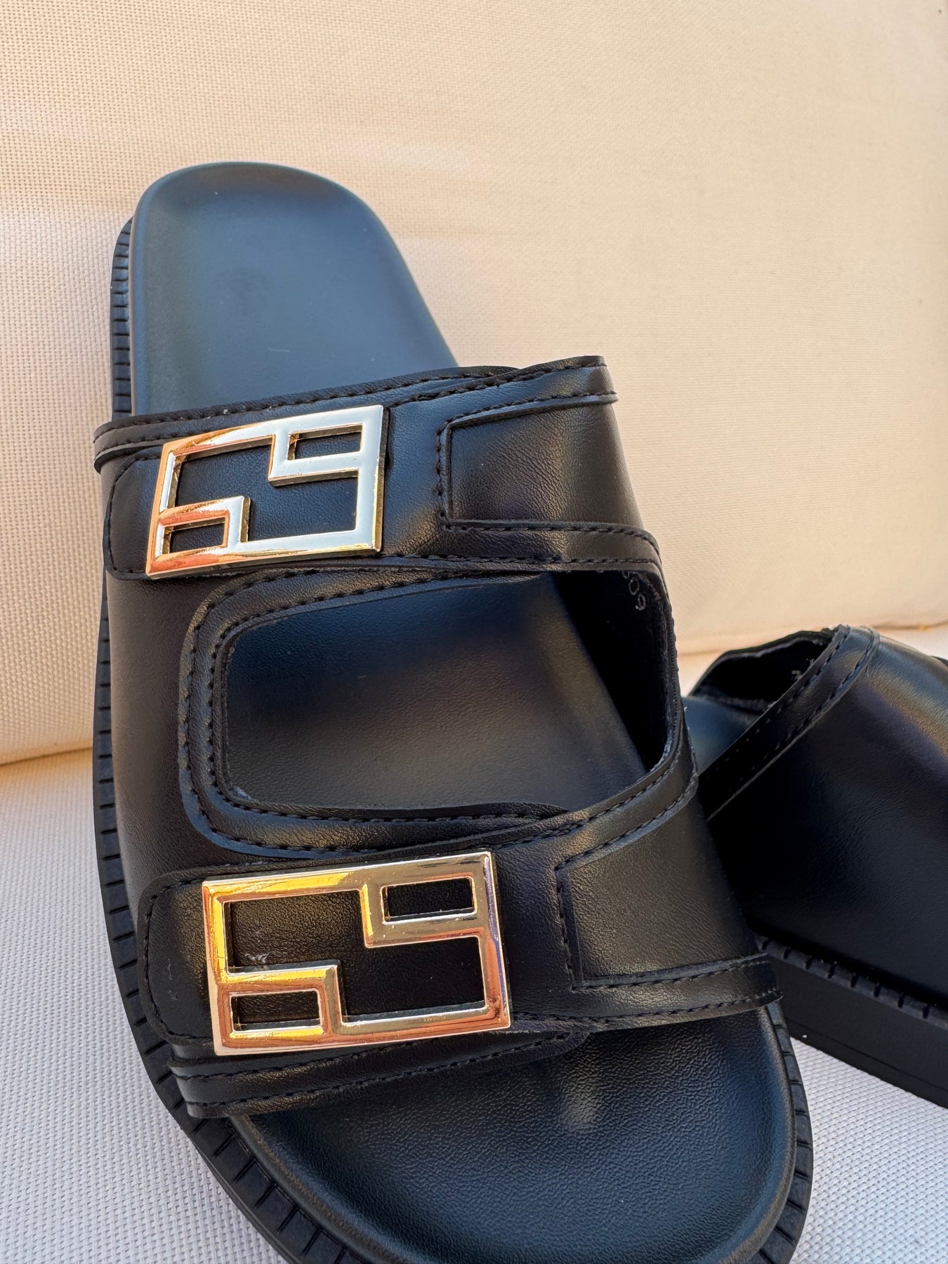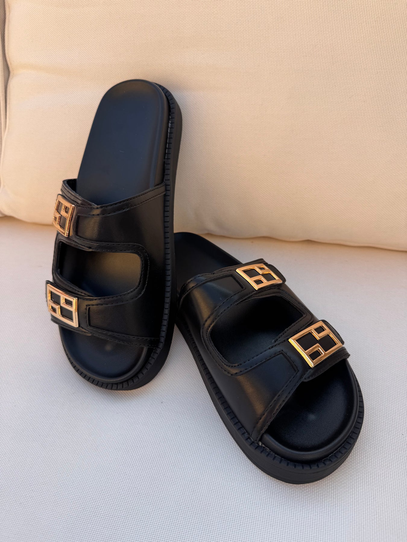 Les claquettes Noa allient élégance et confort avec leur design noir minimaliste et leurs boucles dorées raffinées. À la fois modernes et intemporelles, elles se portent aussi bien en intérieur qu’en extérieur pour un look chic décontracté. Légères et agréables, elles deviendront vite un essentiel de vos journées estivales.