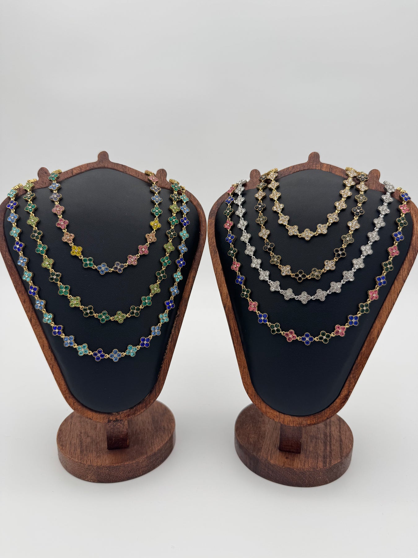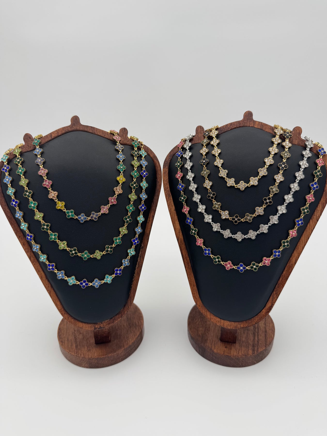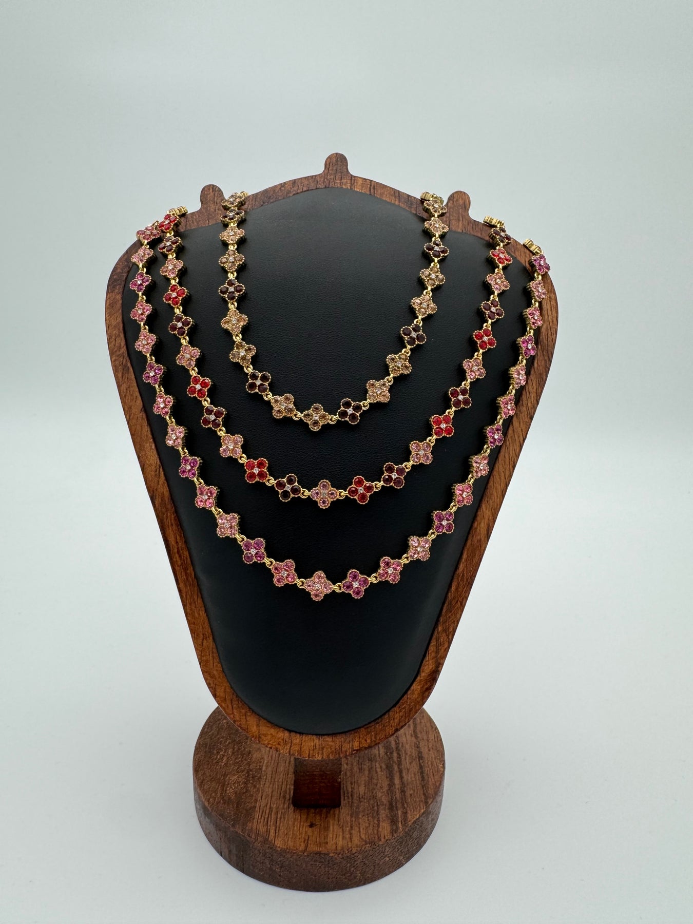 Ces colliers en acier inoxydable ornés de motifs fleurs sertis de pierres colorées apportent une touche élégante, lumineuse et raffinée à votre tenue. Leur design délicat et leur jeu de couleurs subliment le décolleté avec finesse, parfaits pour illuminer aussi bien un look du quotidien qu’une tenue plus habillée.