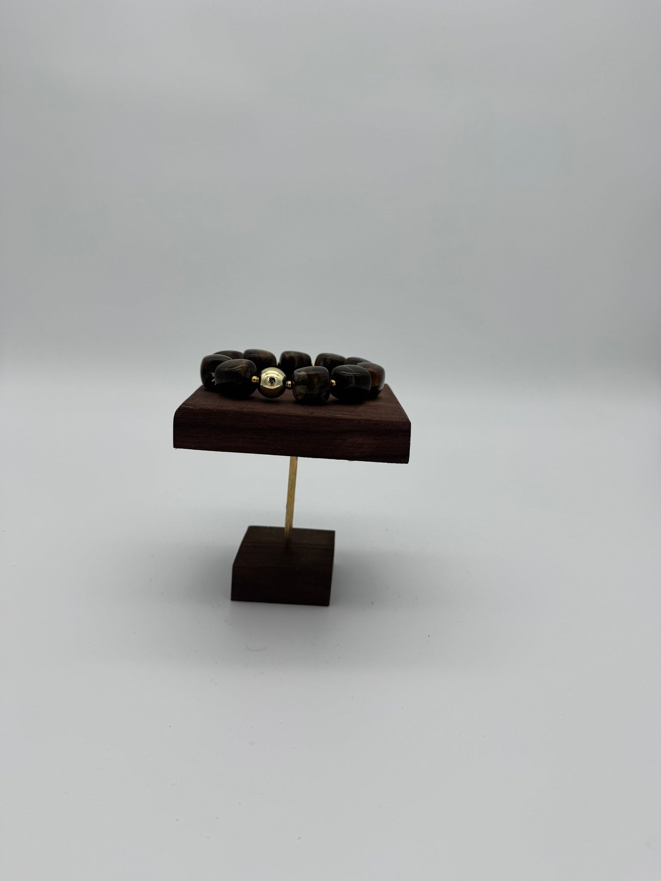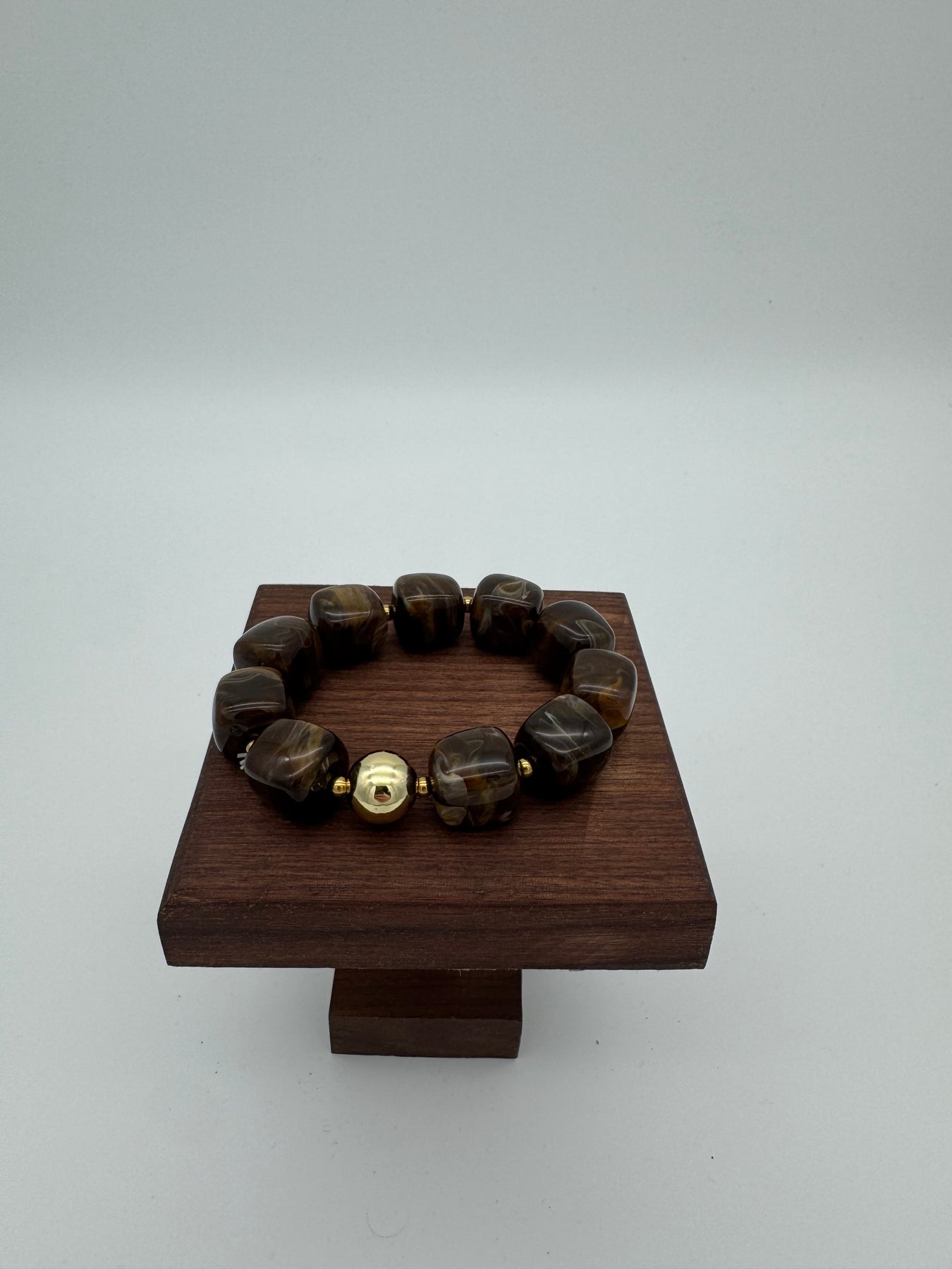 Le bracelet en résine marbrée brun profond et doré apporte une touche élégante et intemporelle à votre poignet. Son coloris chaud et intense, sublimé par une perle centrale dorée, crée un contraste chic et sophistiqué, parfait pour un look du quotidien comme pour une tenue plus habillée.