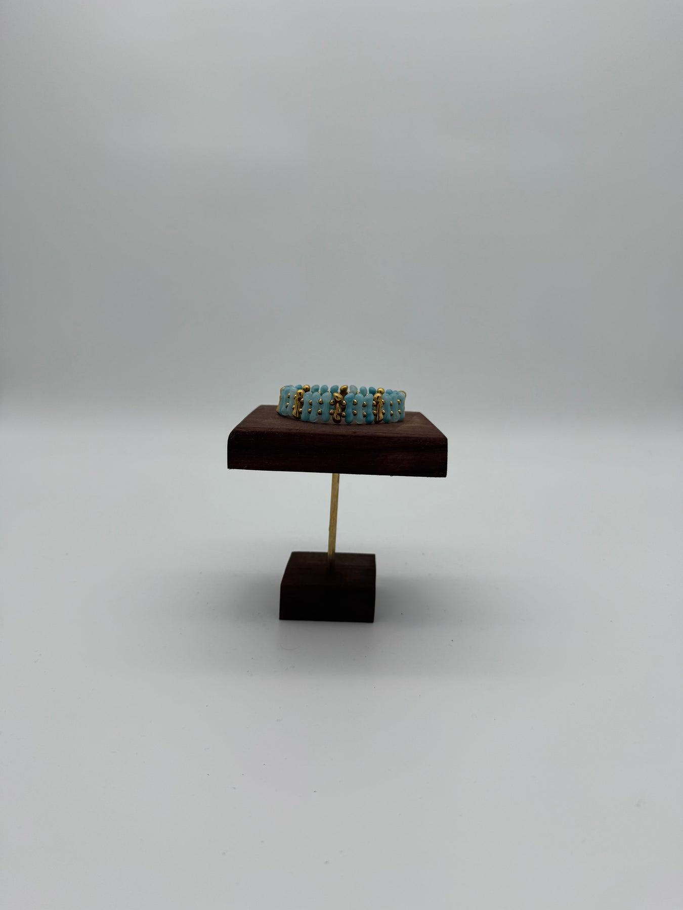 Le bracelet en perles bleu ciel et doré apporte une touche fraîche, lumineuse et élégante à votre poignet. L’association du bleu doux et des perles dorées crée un contraste délicat et raffiné, idéal pour sublimer aussi bien une tenue estivale qu’un look plus habillé.