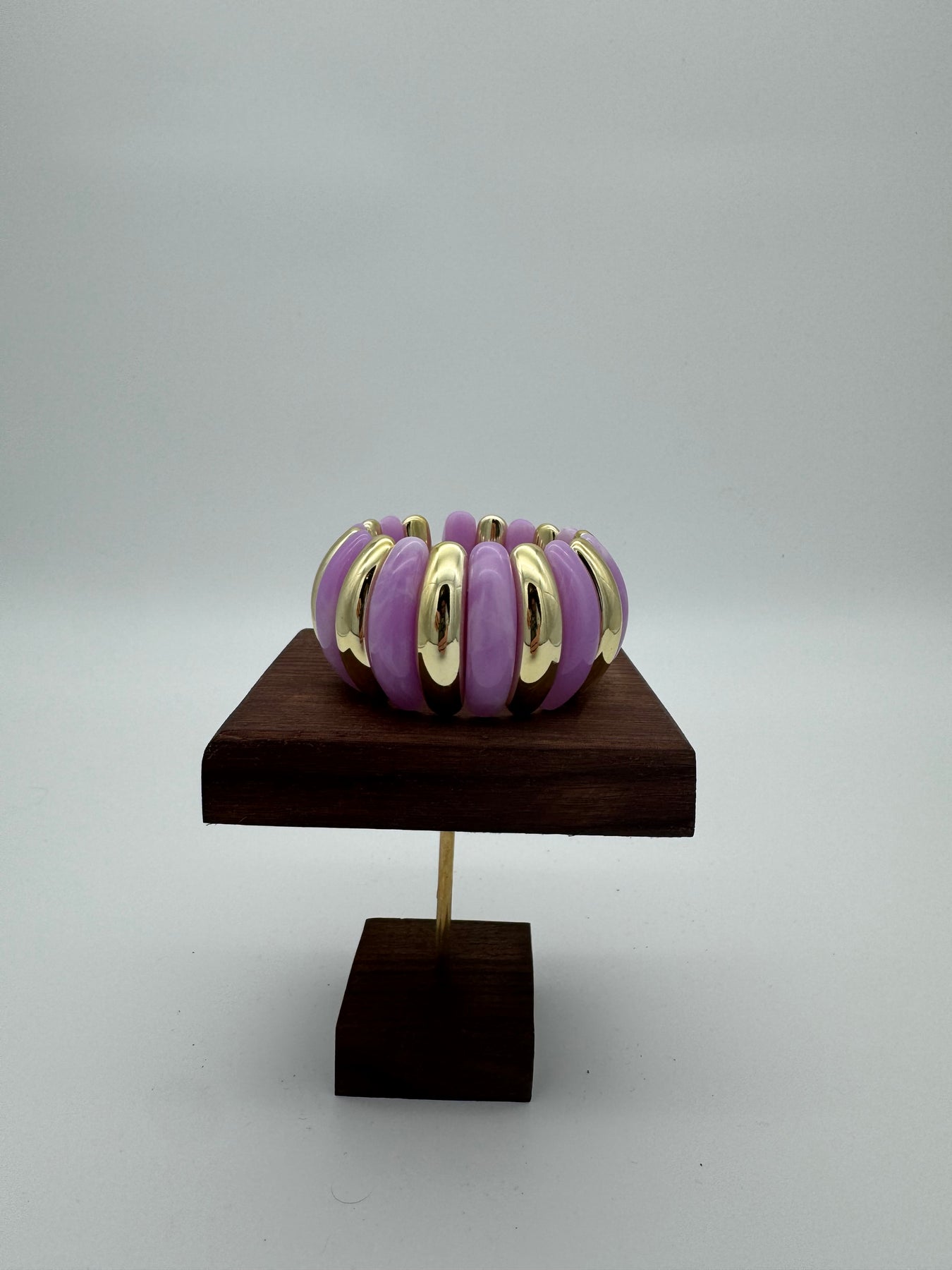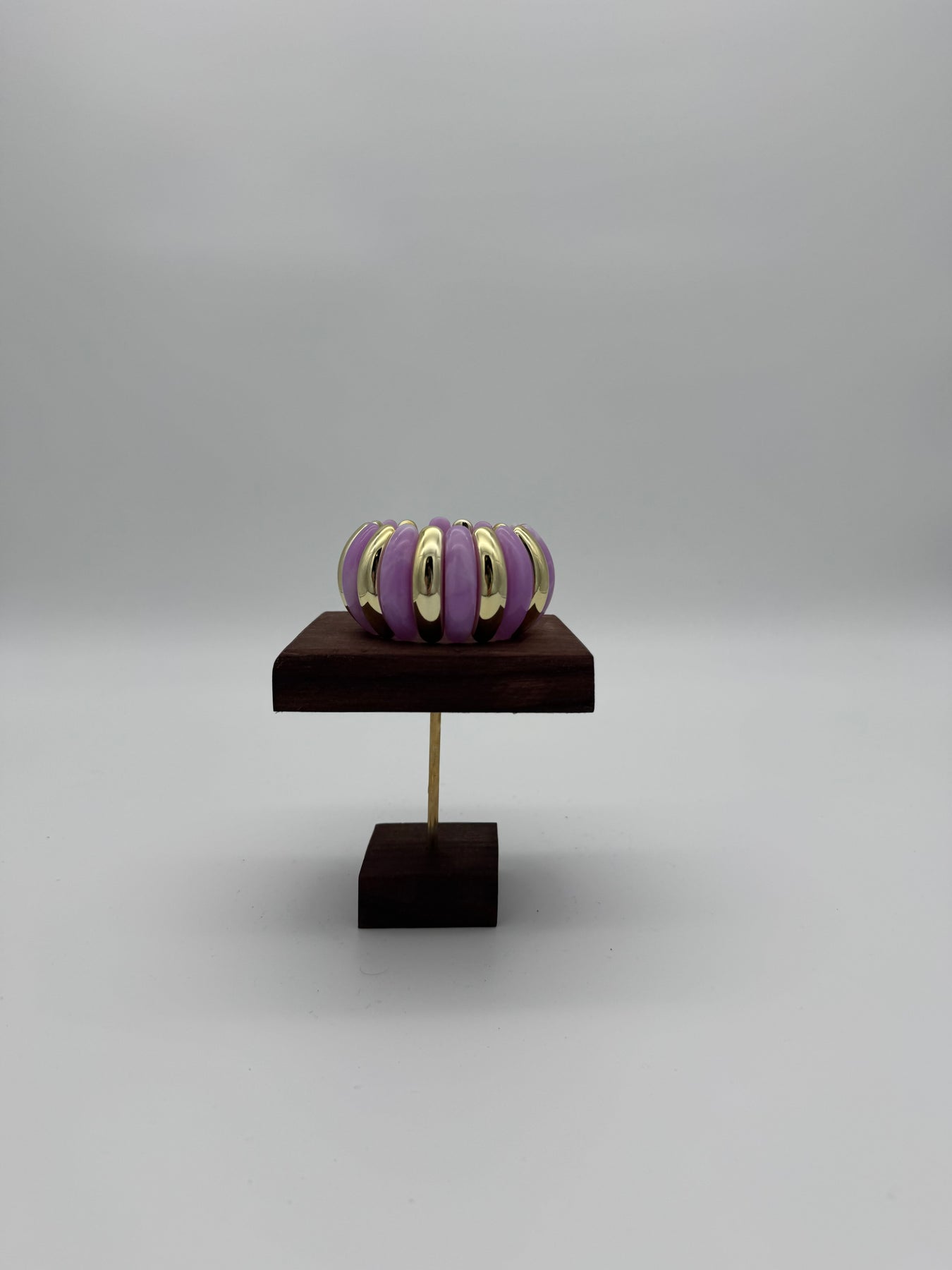 Le bracelet en résine marbrée violette et dorée apporte une touche chic, douce et lumineuse à votre poignet. L’association du violet délicat et des anneaux dorés crée un contraste élégant et raffiné, parfait pour illuminer une tenue sobre ou compléter un look plus coloré.