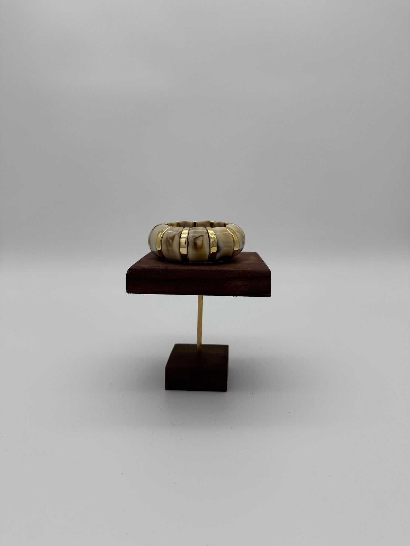Le bracelet en résine marbrée beige et brun, sublimé par des intercalaires dorés, apporte une touche chic et lumineuse à votre poignet. Son jeu de matières et de couleurs crée un contraste doux et élégant, idéal pour compléter aussi bien une tenue du quotidien qu’un look plus habillé.