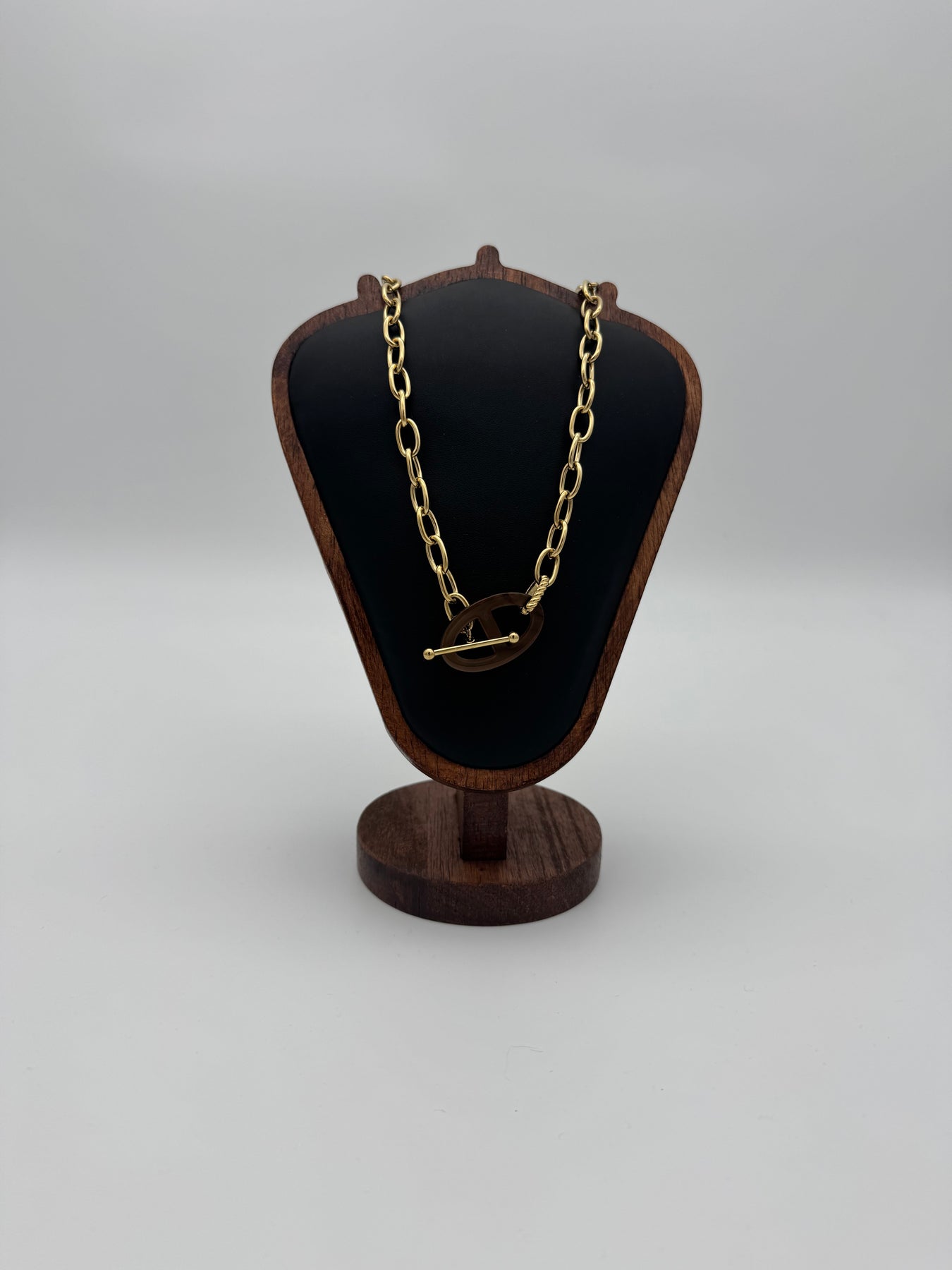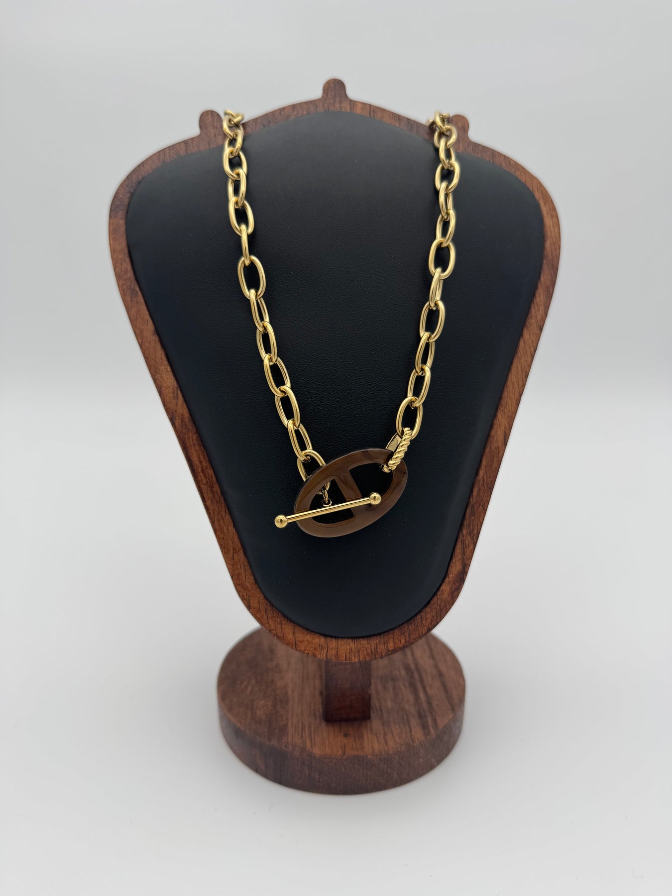 Ce collier doré en acier inoxydable séduit par son design moderne et affirmé. Sa chaîne large apporte du caractère, tandis que son fermoir décoratif central effet écaille marron ajoute une touche chic et originale. Un bijou tendance, parfait pour sublimer une tenue simple comme un look plus habillé.