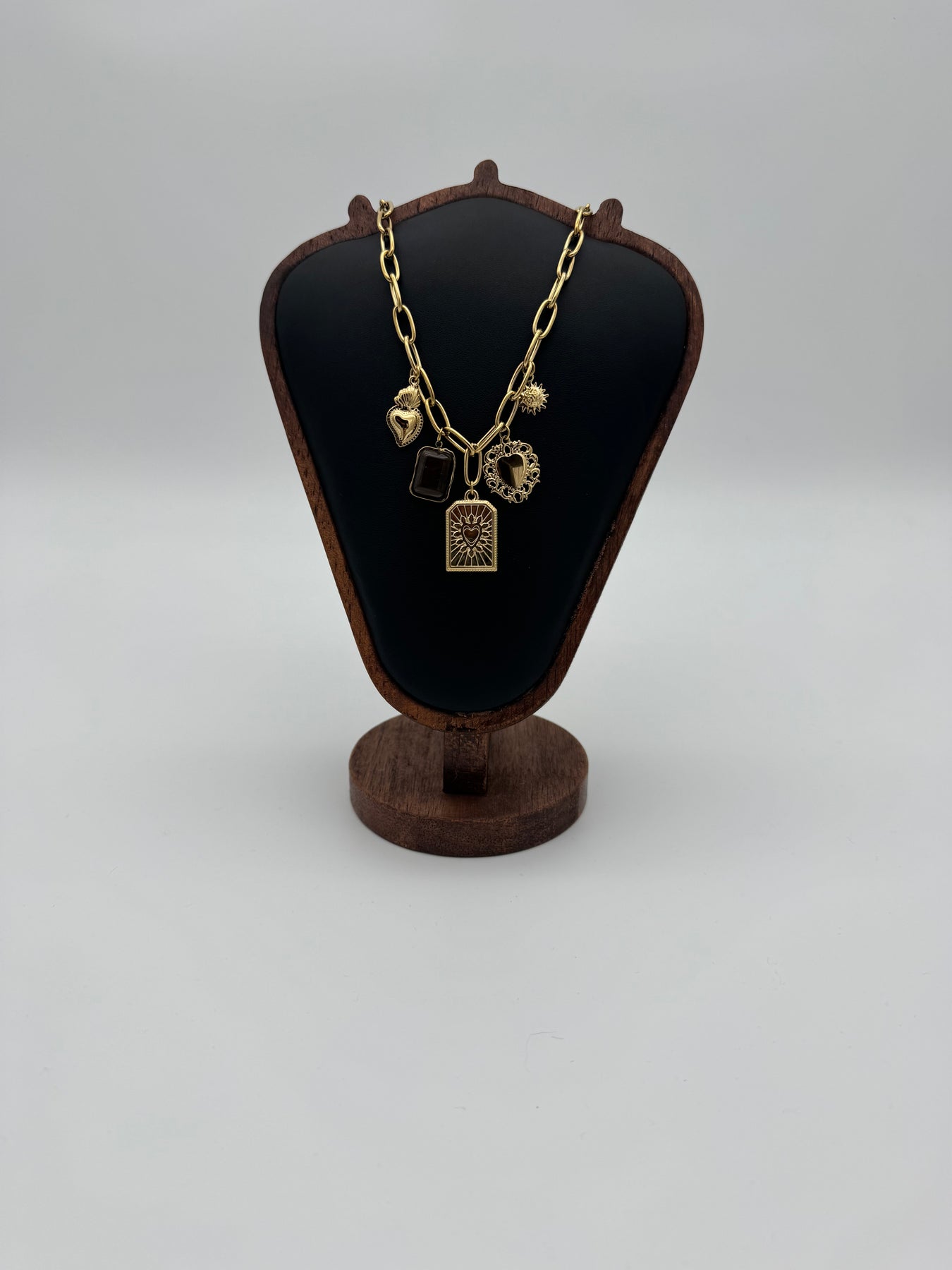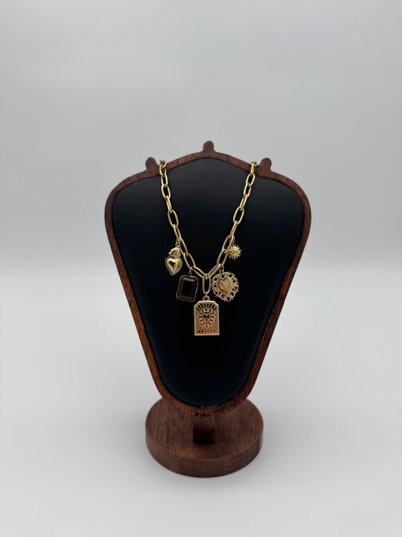 Ce collier doré en acier inoxydable, orné de plusieurs breloques symboliques, apporte une touche bohème, élégante et pleine de caractère à votre tenue. Son mélange de pendentifs aux formes travaillées crée un bijou unique, à la fois tendance et intemporel.