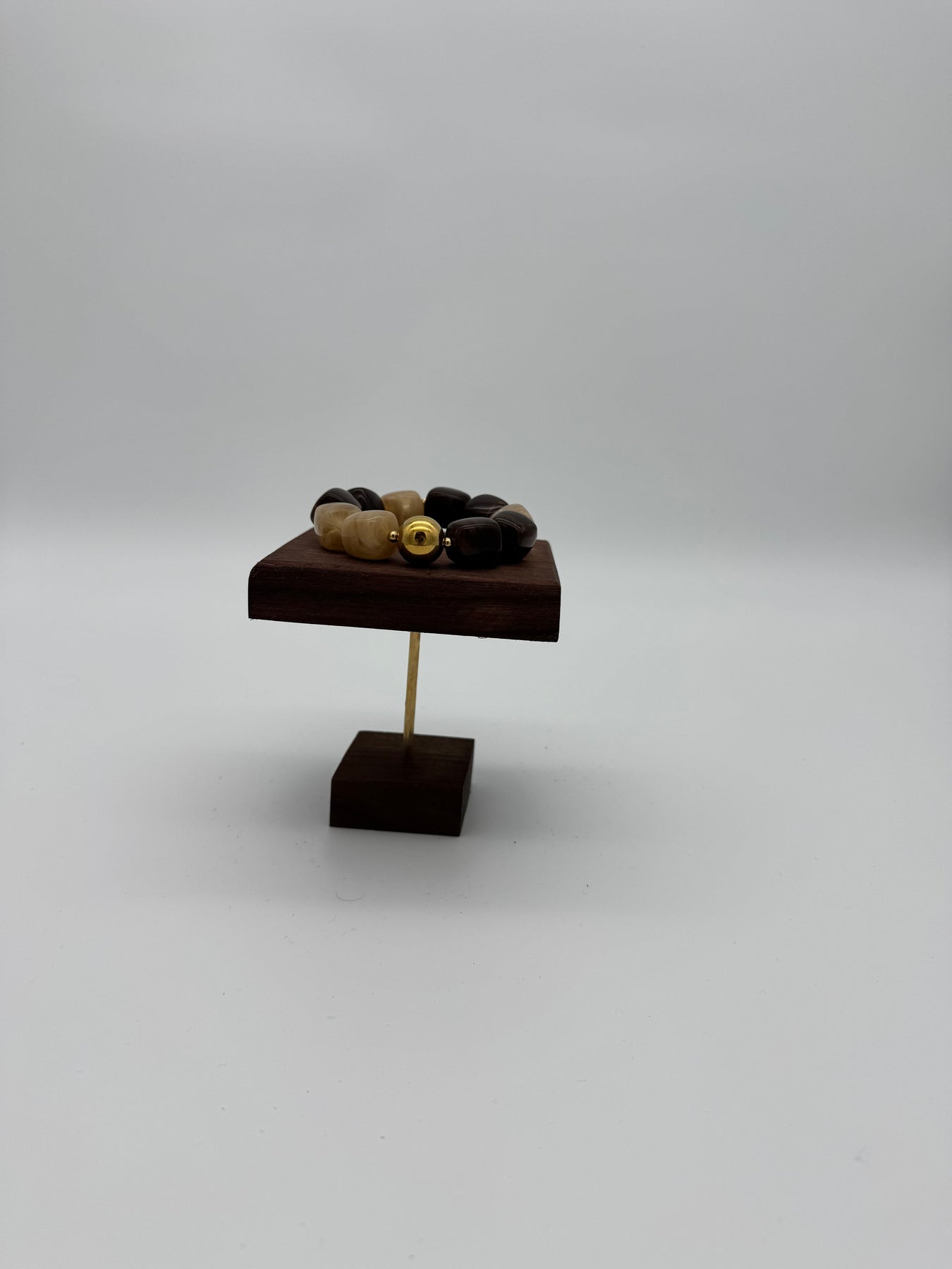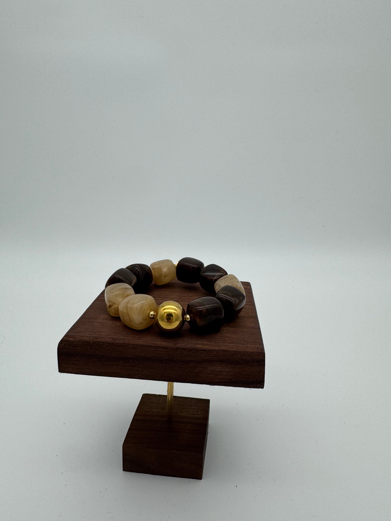 Le bracelet en résine marbrée beige et brun séduit par son contraste naturel et sa perle centrale dorée qui apporte une touche lumineuse et élégante. L’alternance des nuances claires et foncées crée un équilibre chic, idéal pour sublimer une tenue du quotidien comme un look plus habillé.