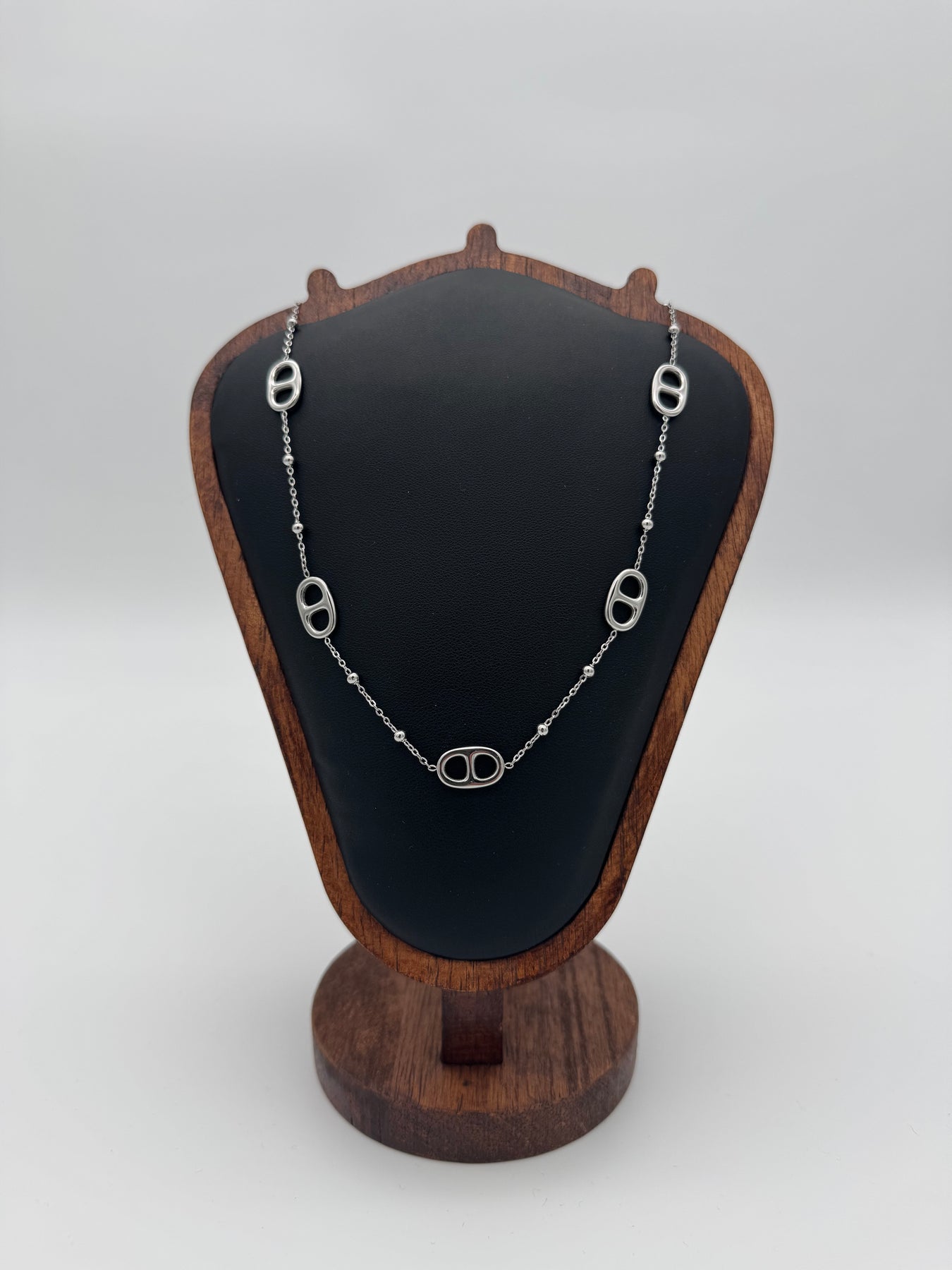 Le collier argenté en acier inoxydable orné de maillons ovales ajourés séduit par son design moderne, épuré et élégant. Son style graphique apporte une touche contemporaine à votre tenue, parfait pour un look chic au quotidien comme pour une tenue plus sophistiquée.